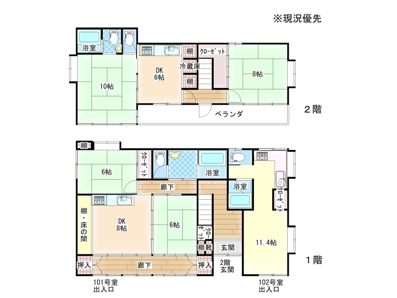 | 備考 | 101号室:2DK 家賃68,000円(2026年3月まで入居中) 102号室:1R 家賃49,000円(2028年3月まで入居中) 2階:2DK 想定家賃70,000円(現在は売主が使用中) 駐車料金1台2,000円、インターネット共有(月額1,500円)、水道料金各戸3分の1ずつ集金、電気個別メーター。 |